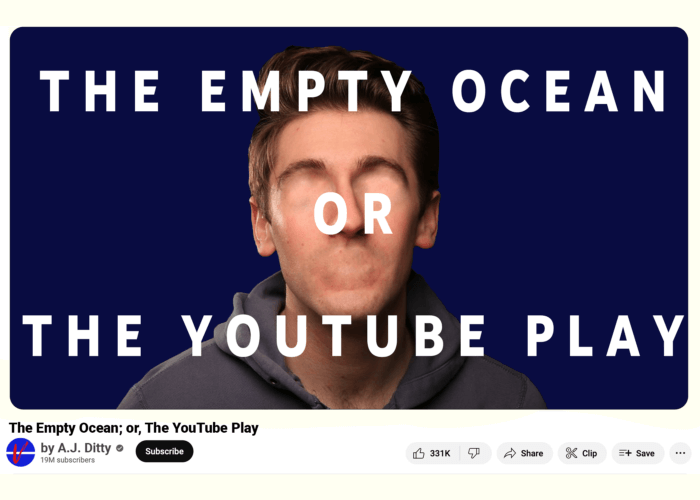 Hey, what’s up subscribers??? Crazy what’s been going on with V’s channel, right? Like, his best friend and long-time collaborator David just left YouTube for good without, like, ANY warning. Something’s off there, fam, I know it. And now they’ve brought on this new girl, Dalia something???, who I hear used to write for The Experiment, yeah, that HBO show about the clones or the aliens or whatever. But now they’re talking about “a new era for the channel” where they’re gonna start making “art”? or something? and I’m just like: whatever happened to the glory days of V and David just, like, blowing up cars with bazookas? Why is David vague-posting about some shady stuff V got up to in the early days of the channel? Why do I feel this emptiness inside of me, this roiling, echoing churn of impossible loneliness that threatens to consume my every waking thought? haHA Don’t forget to smash that like button. Please. Please like me. Please somebody like me. Anybody please please please please pl01se pl10ase p0101ase p01101000 01100101 01101100 01110000 00100000 01101101 01100101.